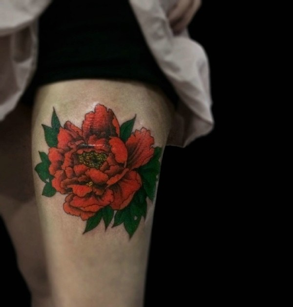 大腿正侧的大红花朵纹身图案鲜艳无比