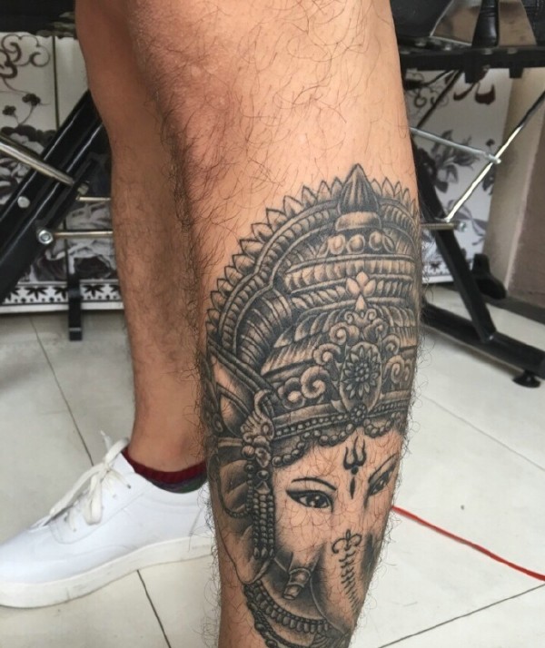 经典的腿部黑白大象神纹身图案