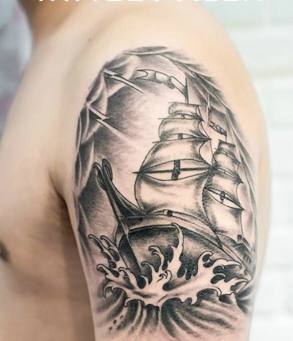 大臂黑白帆船纹身图案个性十足