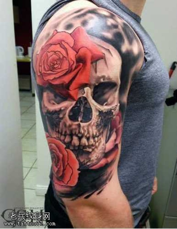 女生手臂经典潮流的骷髅与玫瑰花纹身图案
