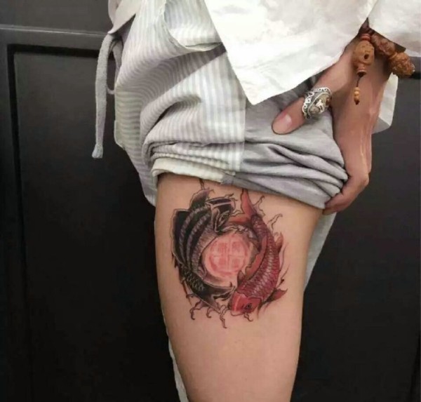 相亲相爱的腿部情侣鲤鱼纹身刺青