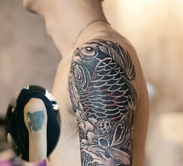 大臂黑白鲤鱼纹身图案个性洒脱