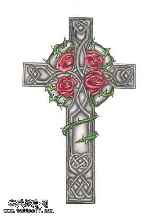 手稿十字架玫瑰纹身图案