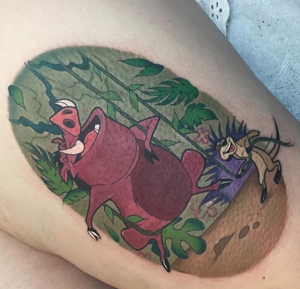 大腿上的狮子王和野猪的纹身图案