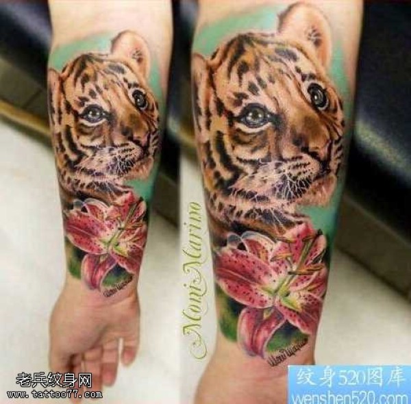 手臂彩色老虎纹身图案
