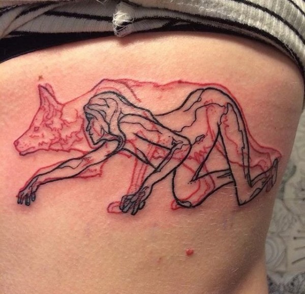 脖子上一个线条人头像纹身的红色线条的狗纹身