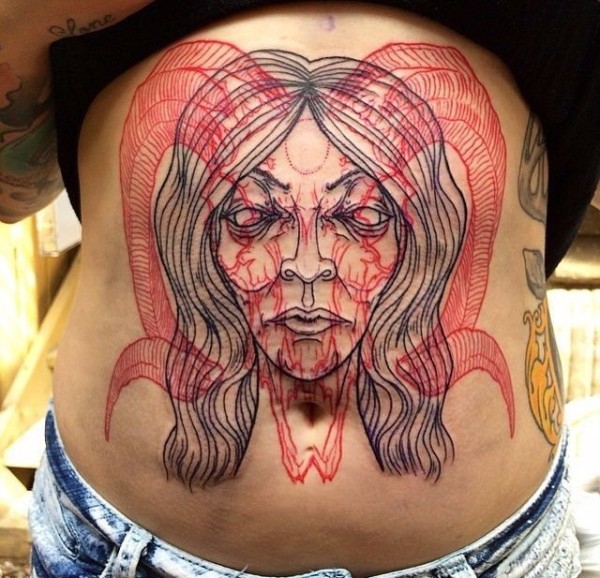 脖子上一个线条人头像纹身的红色线条的狗纹身