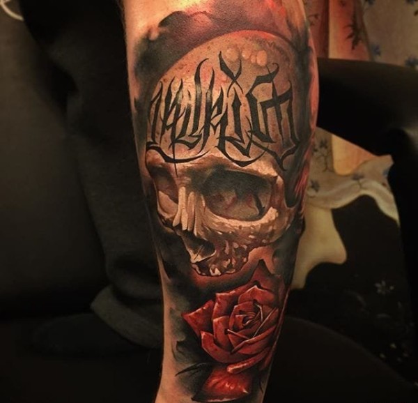 女生手臂经典潮流的骷髅与玫瑰花纹身图案