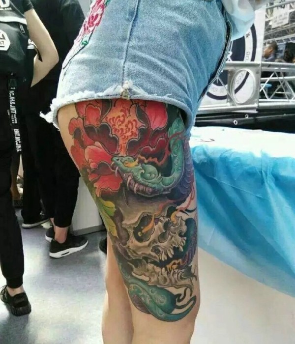超帅时尚的黑灰骷髅与蛇纹身图案