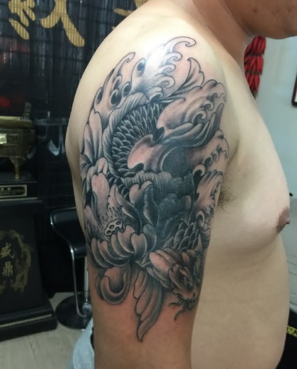 大臂黑白鲤鱼纹身图案帅气十足