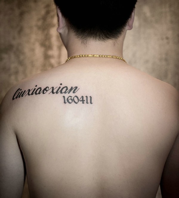 男生后背英文名字与数字的纹身刺青