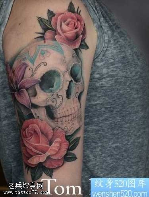 女生手臂经典潮流的骷髅与玫瑰花纹身图案