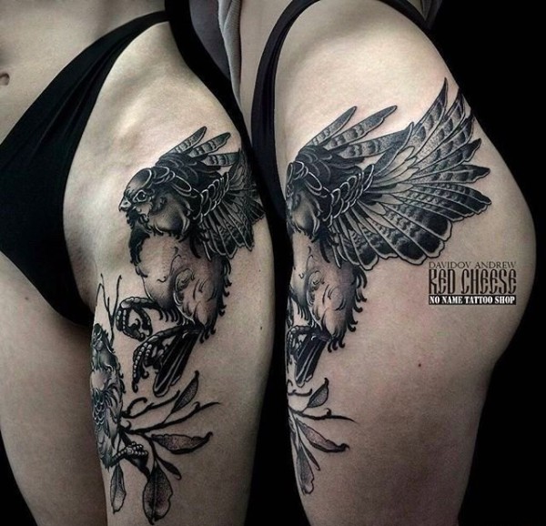 侧肋上一只惊人和巨大的乌鸦纹身