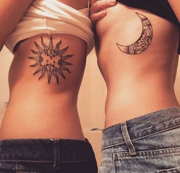 恋人侧肋上的日月纹身图案