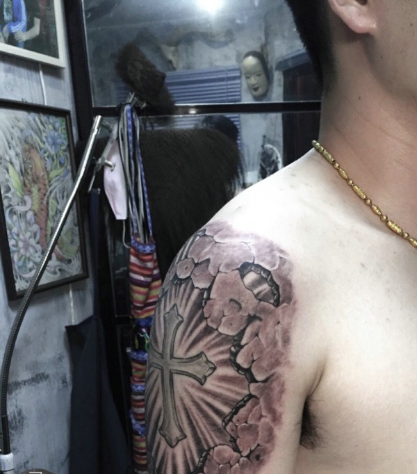 大臂非常霸气的十字架纹身图案
