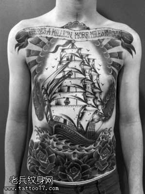 胸部玫瑰船纹身图案
