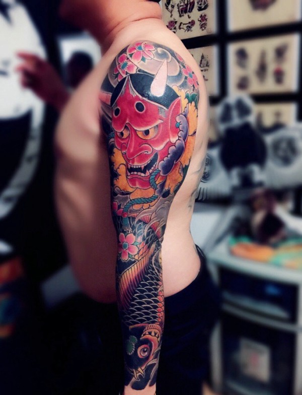 传统花臂般若与鲤鱼的纹身图案