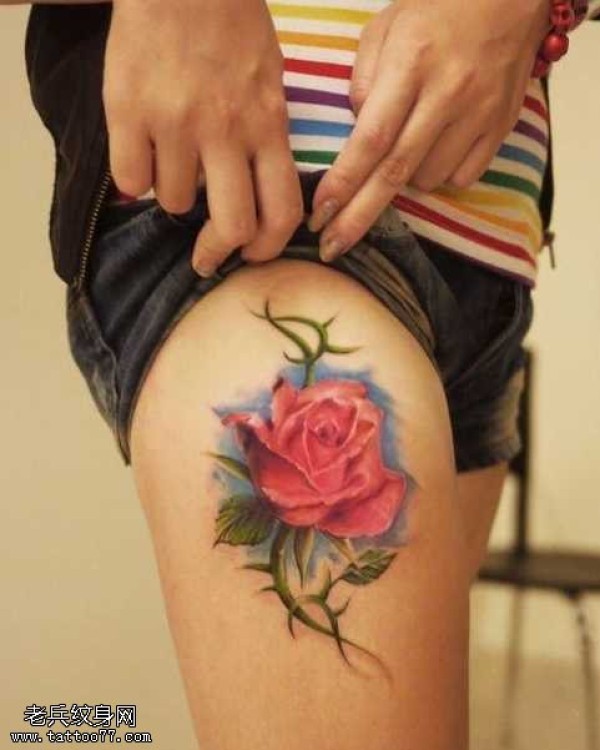 腿部漂亮的彩色玫瑰花纹身图案