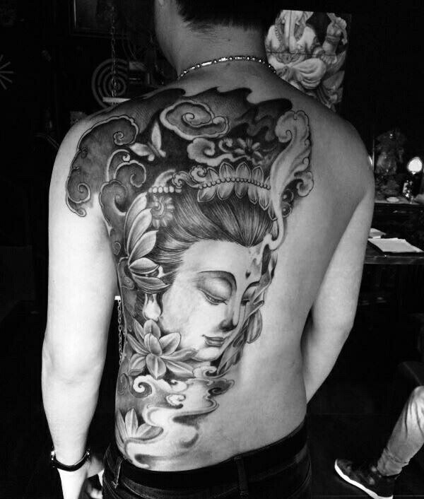 一款半背观音纹身图案信心满满