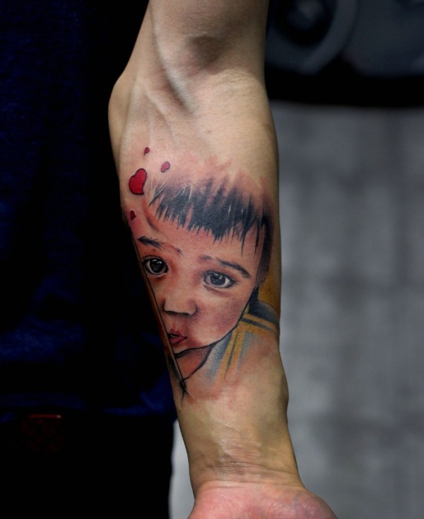 可爱萌萌的手臂小男孩肖像纹身刺青