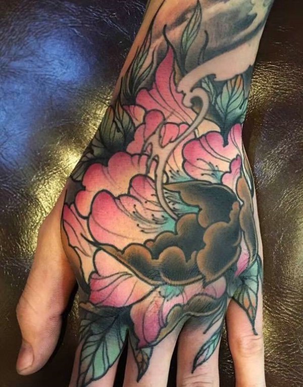 遮盖手背色彩不一的花朵纹身刺青