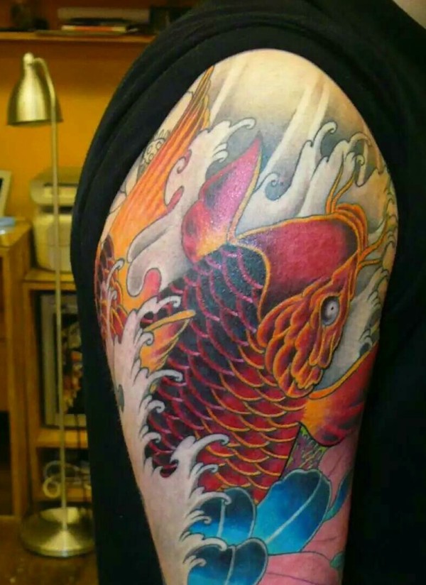 鲜艳清晰的大臂红鲤鱼纹身图案