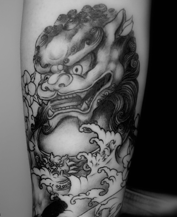 大臂黑白传统唐狮纹身图案酷极了