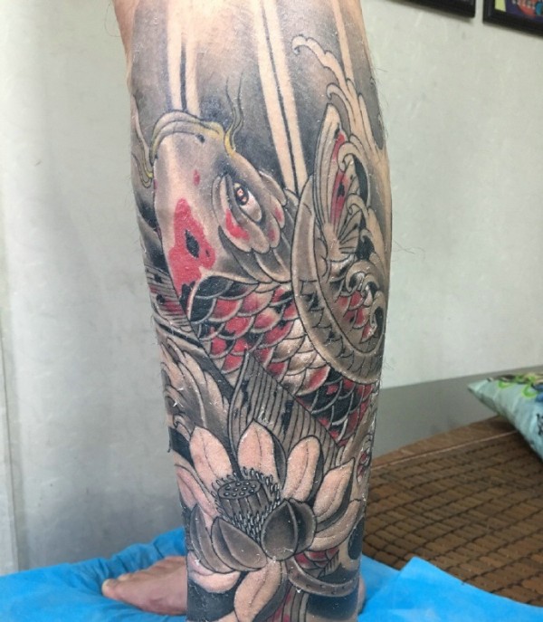 传统鲤鱼花小腿纹身_腿部纹身图案大全_纹身图吧