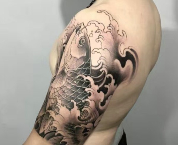 魅力十足的大臂黑白鲤鱼纹身图案