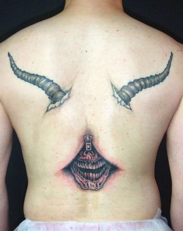 后背破皮而出的羊角恶魔纹身