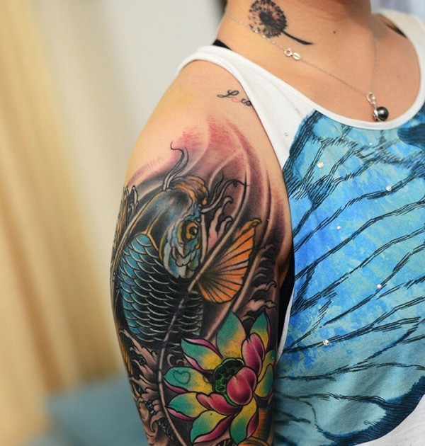 莲花与鲤鱼结合的传统大臂纹身图案