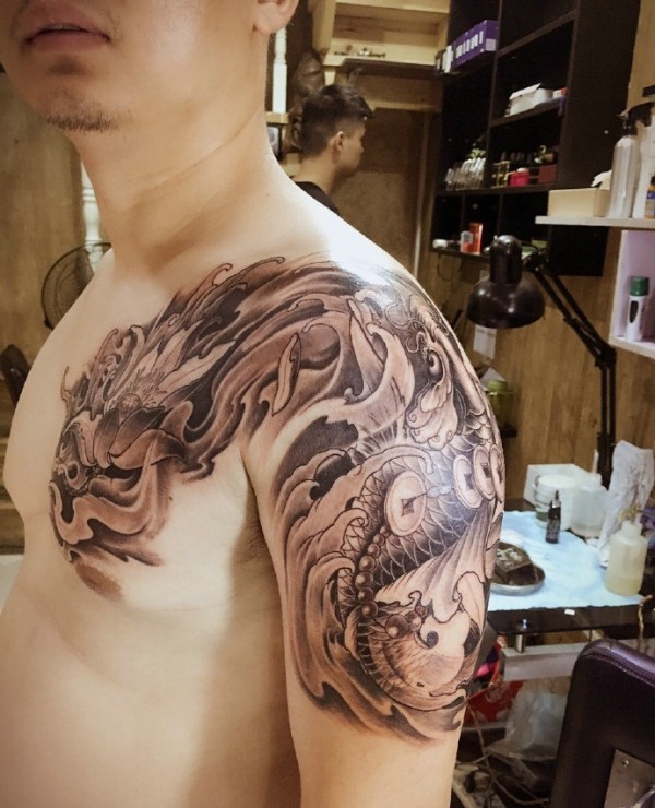 莲花与鲤鱼结合的黑白半甲纹身图案