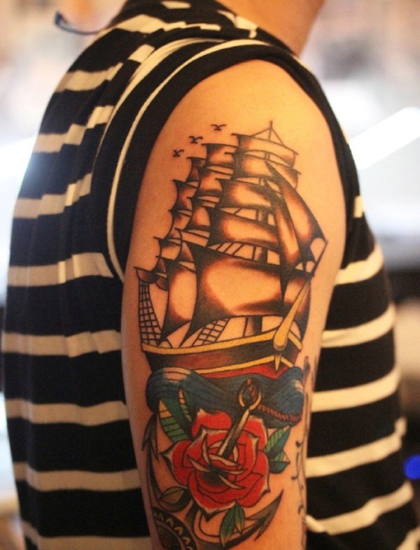 花朵与船帆结合的花臂纹身图案