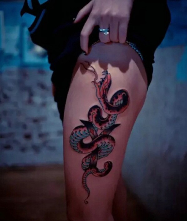 腿部侧边行的可怕花蛇纹身图案