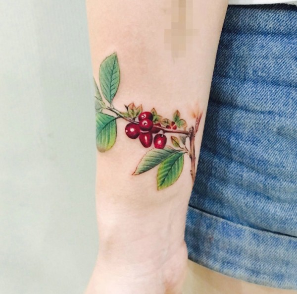 长在树枝里亮丽的手臂樱桃纹身图案
