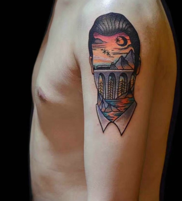 海边夜景的人头像手臂纹身图案