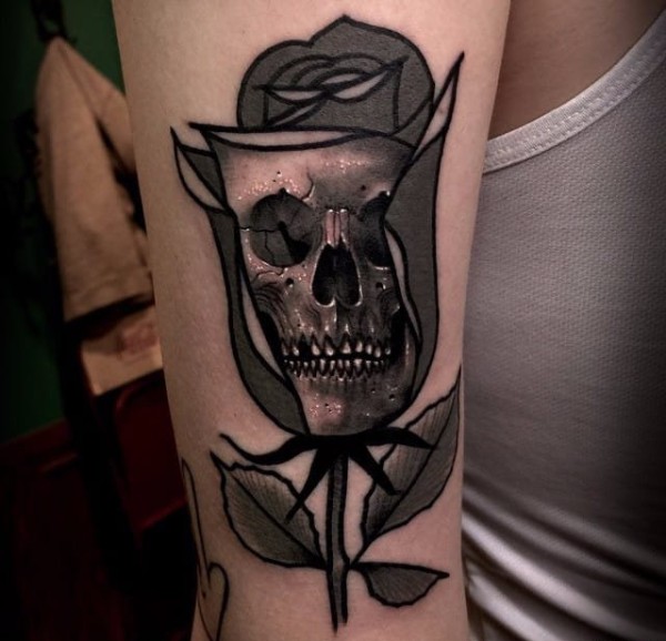 黑灰色玫瑰花和骷髅头纹身图片手稿