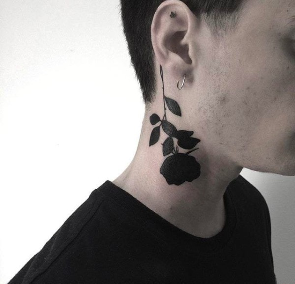 脖子上的纯黑色玫瑰花纹身图案