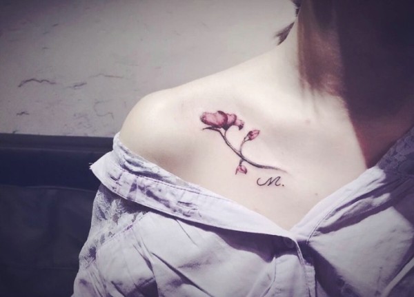 时尚靓丽女生肩膀处的花朵纹身帅气十足
