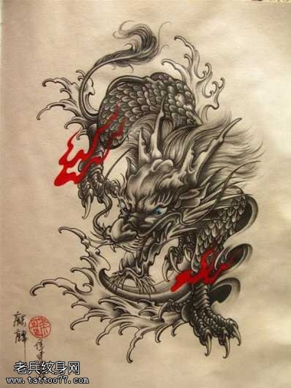 龙纹身手稿_一组老传统黑灰龙手稿纹身图案