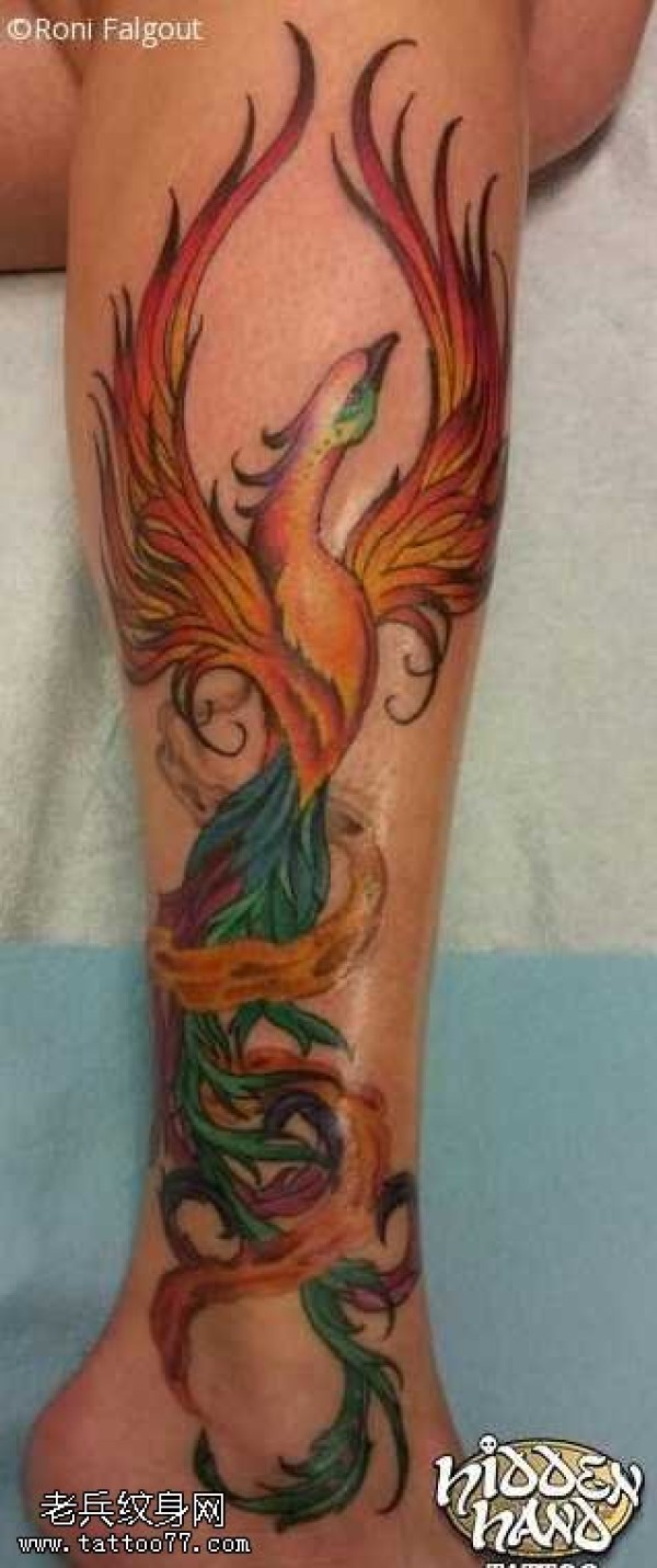 腿上别有凤凰风味纹身图案