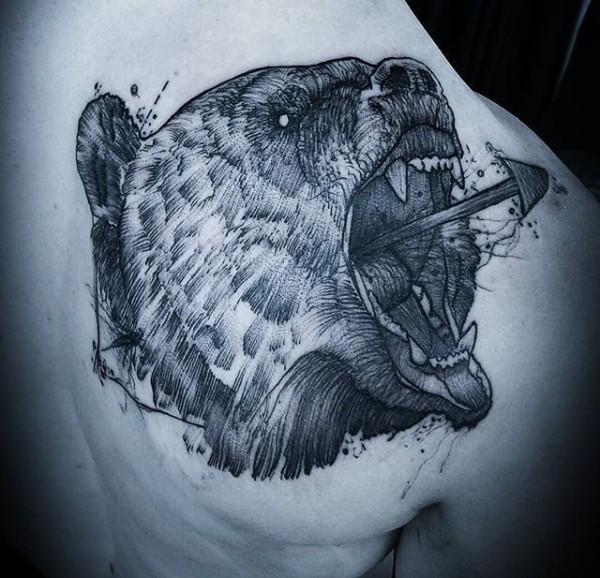 大腿上一条张开大嘴的鲨鱼图案纹身