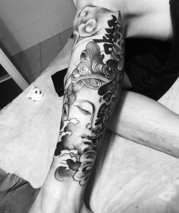 精致的手臂黑灰佛像纹身图案