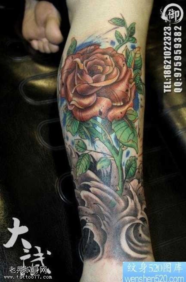 腿部漂亮潮流的彩色玫瑰花纹身图案