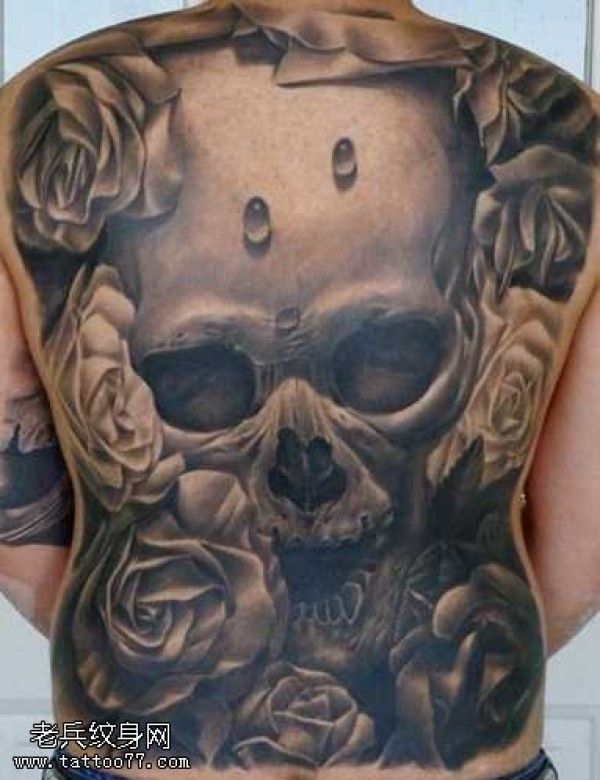 满背黑灰玫瑰骷髅纹身图案