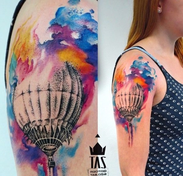 大臂上的蓝色水彩鲸鱼的纹身图案