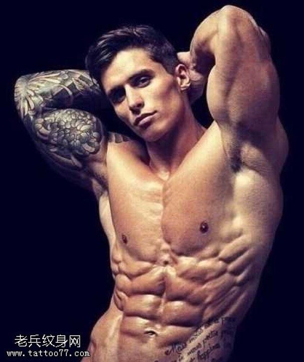 八块腹肌掩映下的花臂纹身图案