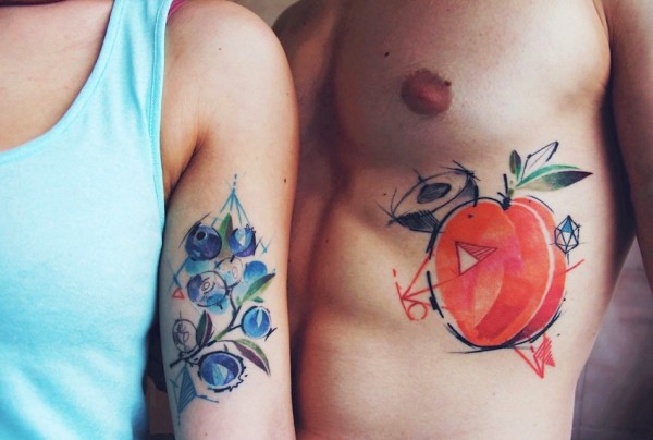色彩诱人的苹果与葡萄的情侣纹身图案