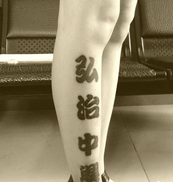 小腿正面的个性汉字单词纹身刺青