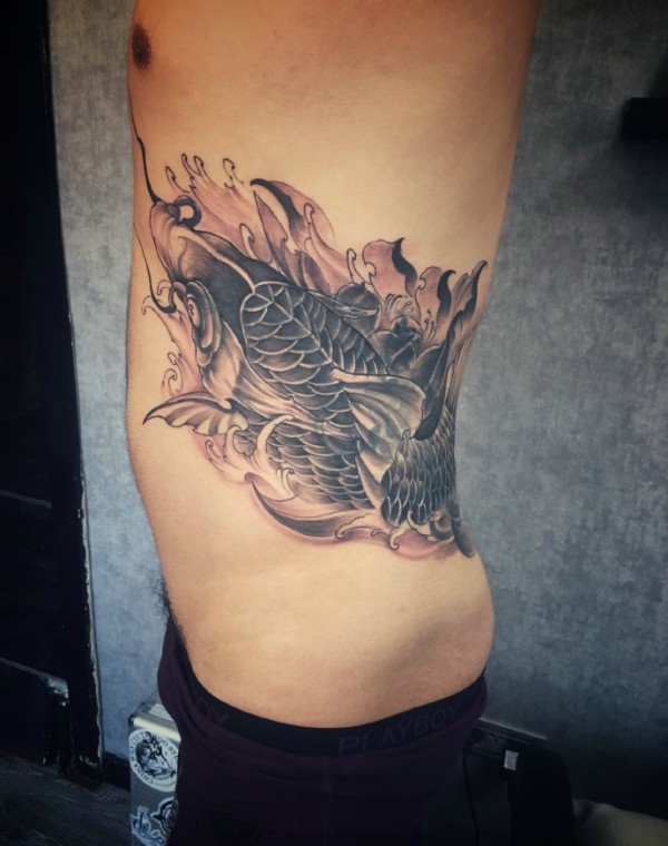 围绕着男生侧腰部的活跃鲤鱼纹身图案